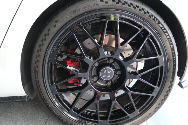 Bremsen: Alcon Rennbremsanlage der neuesten Generation. Große, leichte 6-Kolben-Monobloc-Bremssättel aus Aluminium. Leichte, geschlitzte 380-mm-Rennbremsscheiben. Endless Racing Bremsbeläge. Hinten: Gelochte Bremsscheiben und Ferodo Performance-Bremsbeläge. Stahlflex-Bremsleitungen mit Motul Racing-Öl.